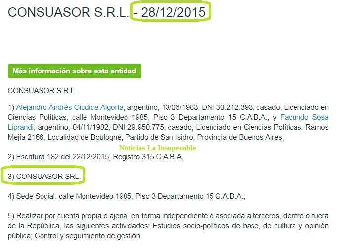 Ya Página 12 había develado en enero de este año la maniobra ilegal de Laura Alonso, titular de la Secretaría de Ética Pública, Transparencia y Lucha contra la Corrupción, cuya tarea es precisamente investigar el conflicto de intereses estatales y privados. Sin embargo, la OA contrató en 2017 a una empresa que dirigía el fallecido Juan Gentile, ex jefe de prensa del bloque PRO en el Congreso entre 2008 y 2012, responsable de prensa del PRO entre 2012 y 2015 y subsecretario de Comunicación Pública desde el inicio del gobierno de Macri. Quien ahora la dirige es Facundo Sosa Liprandi, gerente de Comunicaciones del PAMI entre 2012 y 2015. El tercer socio fundador de Consuasor es Alejandro Giúdice, ex jefe de Relaciones Institucionales de Walmart. Precisamente en diciembre de 2015, apenas asumió Mauricio Macri la presidencia, se formó la consultora.