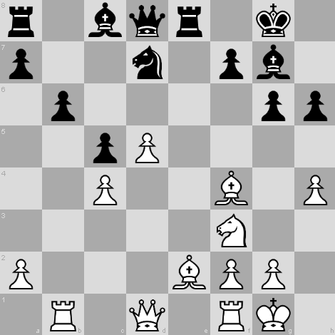 9. Rb1 O-O 10. Be2 b6 11. Be3 Bb7 12. d5 e6 13. c4 Re8 14. O-O exd5 15. exd5 Nd7 16. Bf4 (◀ver diagrama) … Bc8 17. d6 Bb7 18. Re1 Bc3 19. Bd2 Qf6 20. Rb3 Bxd2 21. Qxd2 Kg7 22. h5 Re6 23. hxg6 fxg6 24. Rd1 Rae8 25. Bf1 Bc6 26. Ra3 a5 27. Nh2 h5 28. Nf3 Re4 29. Qc3 Rf4 30. Qxf6+ Kxf6 31. Nh2 Re6 32. Nf3 g5 33. Re3 Rxe3 34. fxe3 Bxf3 35. gxf3 Rxf3 36. Be2 Rxe3 37. Bxh5 Re4 38. Rb1 Rxc4 39. Be8 Ke6 40. Bxd7+ Kxd7 41. Rxb6 Ra4 42. Kf2 Rxa2+ 43. Ke3 Ra4 44. Kd3 Rd4+ 45. Kc3 Rb4 46. Ra6 a4 0-1 [La partida puede reproducirse en el visor de chessgames.com]
