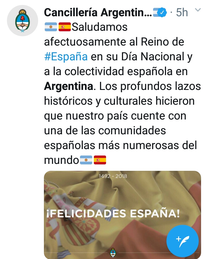En un tuit que parece sacado del arcón de los recuerdos, pero a tono con la política exterior del gobierno de Cambiemos, la cancillería argentina envió hoy, 12 de octubre, un saludo afectuoso al Reino de España.