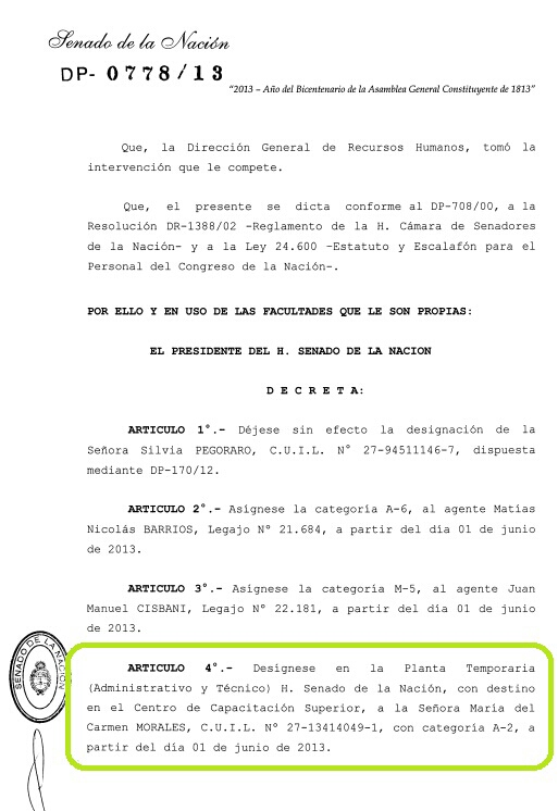 Ángela Patricia Reyna fue designada en la Planta Temporaria del Senado de la Nación a partir del 1º de diciembre de 2016 según indica la RSA-1619/16 a solicitud del Senador Ángel Rozas, suplantando a su hermano Aldo Carlos Alejandro Reyna, quien ocupaba su cargo desde el 1º de mayo de 2014.