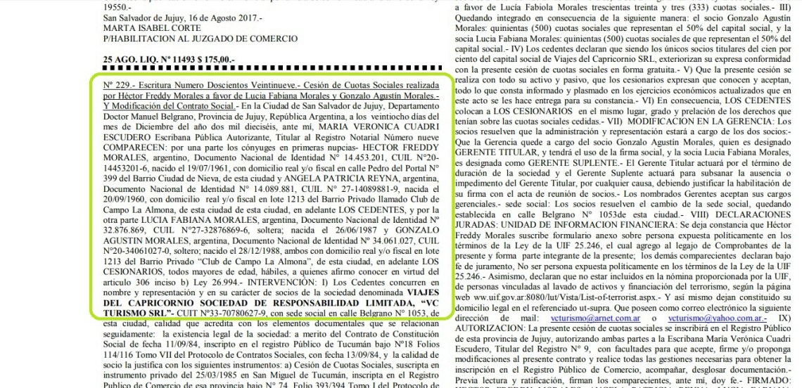 Dos días antes del ingreso de Freddy a la sociedad, el 7 de abril, el menor de los Morales, Walter Rolando Morales, se convirtió en el apoderado de la empresa, una década más tarde, en febrero de este año, Freddy pasó a controlar la totalidad de la agencia de viajes junto a su esposa, Ángela Patricia Reyna, Viajes del Capricornio es conocida en Jujuy como VC Turismo.