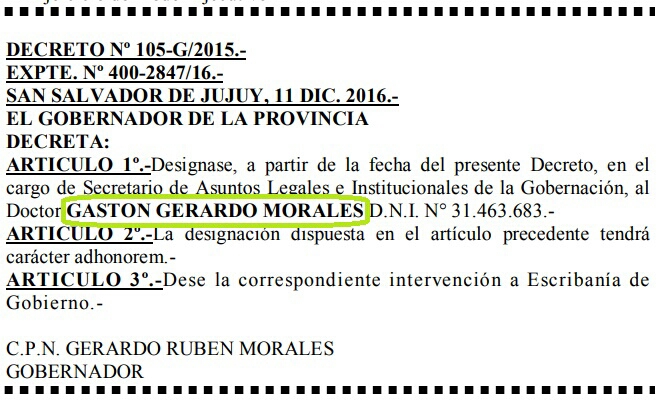 A su hijo Gastón Gerardo Morales lo designó él mismo por decreto como Secretario de Asuntos Legales e Institucionales de la Gobernación en diciembre de 2016.