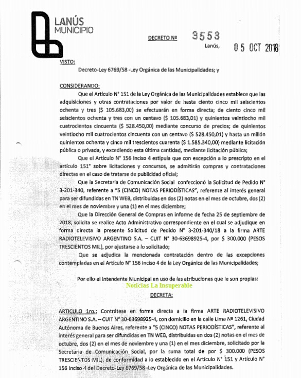 “Contrátese en forma directa a la firma ARTE RADIOTELEVISIVO ARGENTINO S.A. -CUIT N’ :30-63698925-4, con domicilio en la calle Lima Nº 1261, Ciudad Autónoma de Buenos Aires, referente a «5 (CINCO) NOTAS PERIODÍSTICAS», referente al interés general para ser difundidas en TN WEB, distribuidas en dos (2) notas en el mes de octubre, dos (2) en el mes de noviembre y una (1) en el mes diciembre, solicitado por la Secretaria de Comunicación Social, por la suma total de por $ 300.000 (PESOS TRESCIEI\TOS MIL)”.