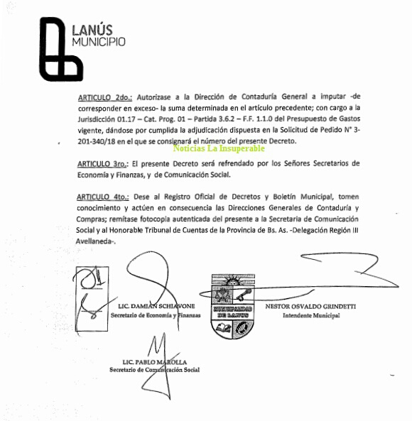 A través del Decreto 3553, Néstor Grindetti autorizó el pago de una Contratación Directa a Arte Radiotelevisivo Argentino (ARTEAR) de 300.000 pesos a cambio de cinco notas periodísticas a ser difundidas en uno de los canales con menos llegada del Grupo Clarín: TN WEB.