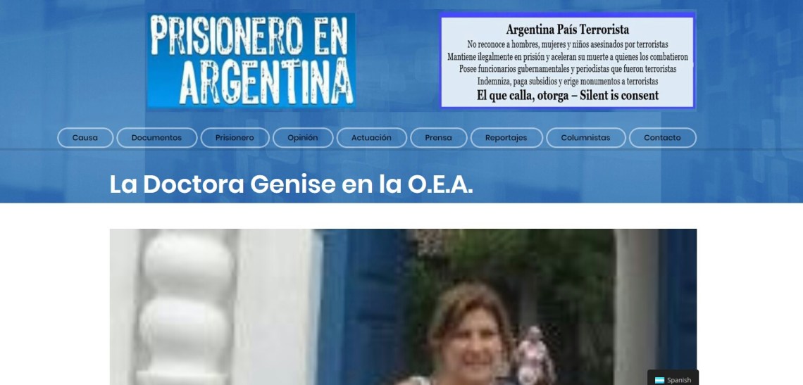 “Argentina País Terrotista. No reconoce a hombres, mujeres y niños asesinados por terroristas. Mantiene ílegalmente en prisión y aceleran su muerte a quienes los combatieron. Posee funcionarios gubernamentales y periodistas que fueron terroristas. Indemniza, paga subsidios y erige monumentos a terroristas” puede leerse en la página web.