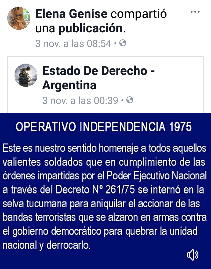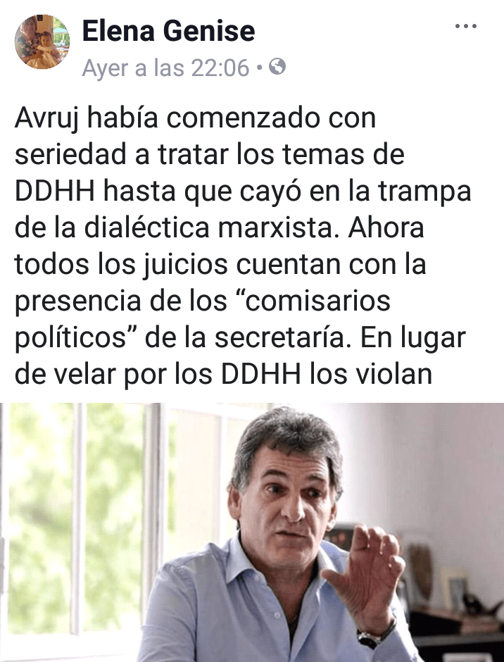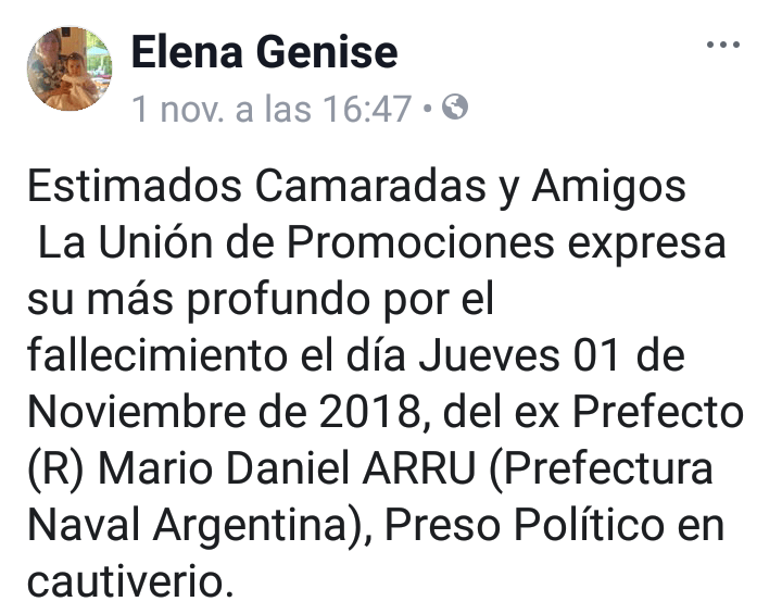 Dentro de esta tónica, la abogada Elena Rita Genise lleva su predicamento a las redes sociales, como por ejemplo el pasado 1º de noviembre cuando se expresó en ocasión del fallecimiento de Mario Daniel Arrú, el genocida culpable por haber arrojado vivas al mar a las mojas francesas Alice Domon y Léonie Duquet, además de a otras diez personas, el 14 de diciembre de 1977. Elena Rita Genise expresó en su Facebook que Arrú era “un preso político”.