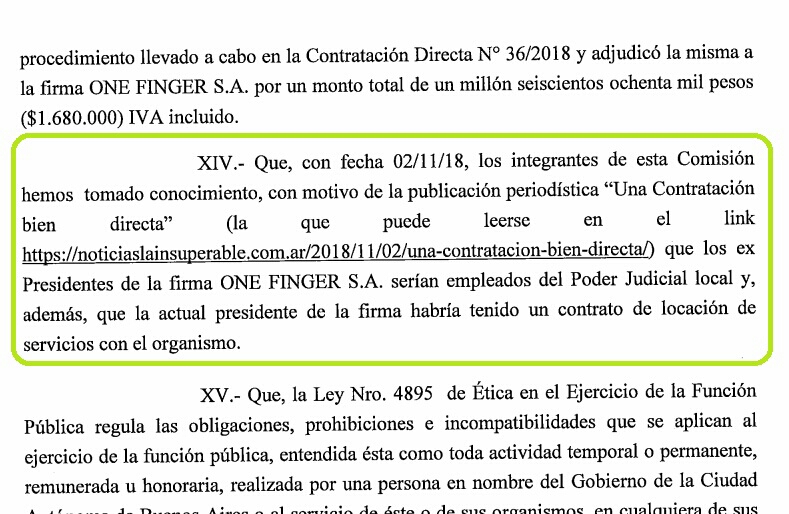 Así, con fecha 6 de noviembre de 2018 la Comisión de Administración, Gestión y Modernización Judicial del Consejo de la Magistratura de la Ciudad de Buenos Aires emitió la Resolución CAGyMJ N.º 106/2018. En la misma, en el punto XIV de los Considerandos se especifica “Que, con fecha 02/11/18, los integrantes de esta Comisión hemos tomado conocimiento, con motivo de la publicación periodística “Una Contratacion bien directa” que los ex Presidentes de la firma ONE FINGER S.A. serían empleados del Poder Judicial local y, además, que la actual presidente de la firma habría tenido un contrato de locación de servicios con el organismo”.