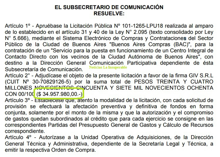 Así es como, dentro de este habitual despilfarro, se ha conocido hoy la RESOLUCIÓN N.° 130/SSCOMUNIC/18 que, con firma de Federico María Di Benedetto, Subsecretario de Comunicación, aprobó la licitación “para la contratación de un «Servicio para la puesta en funcionamiento de un Centro Integral de Contacto Directo con los vecinos de la Ciudad Autónoma de Buenos Aires», con destino a la Dirección General Comunicación Participativa”.
