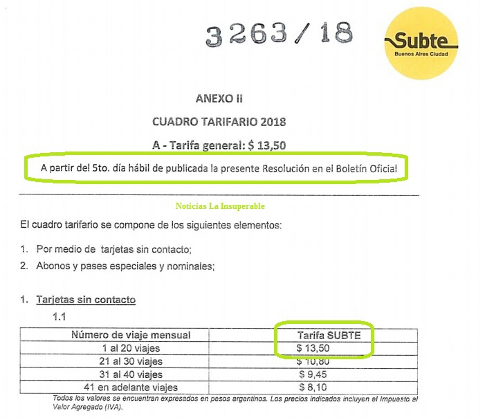 Con fecha del lunes 12 de noviembre se publicó en el Boletín Oficial de la Ciudad de Buenos Aires la Resolución de Directorio N° 3263/SBASE/18 que autoriza sucesivos aumentos en el valor del pasaje de SUBTE.