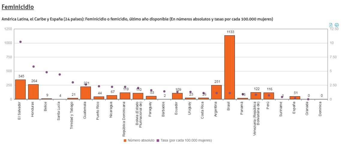 El términos absolutos, la lista de feminicidios la lidera Brasil (con 1.133 víctimas confirmadas en 2017). No obstante, si se compara la tasa por cada 100.000 mujeres, el fenómeno alcanza una extensión en El Salvador que no encuentra paralelo en otro país de la región: 10,2 feminicidios por cada 100.000 mujeres. En 2016, Honduras registró 5,8 feminicidios por cada 100.000 mujeres. En Guatemala, República Dominicana y Bolivia también se observaron altas tasas en 2017, iguales o superiores a 2 casos por cada 100.000 mujeres. Solamente Panamá, Perú y Venezuela registran tasas inferiores al 1,0 en la región.