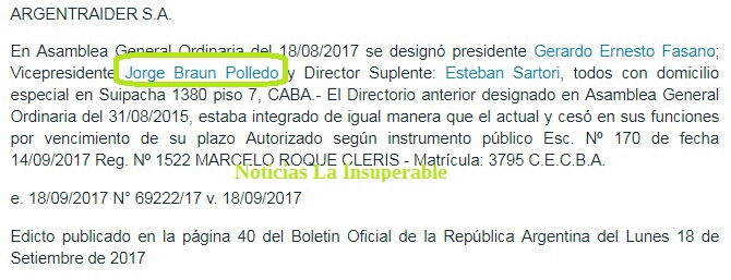 Jorge Braun Polledo es primo hermano de Marcos Peña. Su padre, Jorge Alfredo Braun Cantilo es hermano de la madre del Jefe de Gabinete, Clara Braun Cantilo. En septiembre del año pasado, en reunión de Directorio, fue confirmado como Vicepresidente de Argentraider, firma varias veces investigada por la justicia en casos de evasión impositiva y narcotráfico.