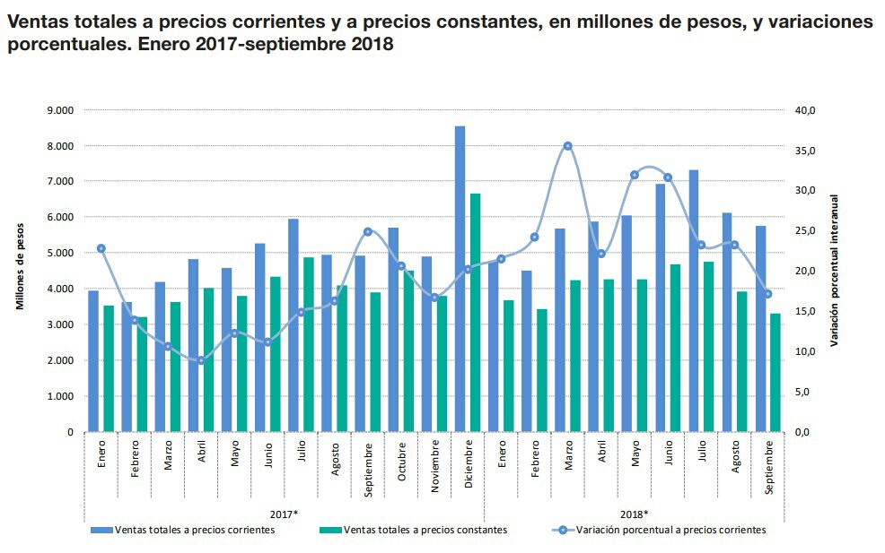 Según las cifras del INDEC, Las ventas a precios corrientes en septiembre de 2018 relevadas en la encuesta alcanzaron un total de 5.749,9 millones de pesos, lo que representa un aumento de 17,2%, respecto al mismo mes del año anterior. Las ventas a precios constantes de abril de 2016, en septiembre de 2018, alcanzaron un total de 3.302,3 millones de pesos, lo que representa una disminución de 15,1% respecto al mismo mes del año anterior.