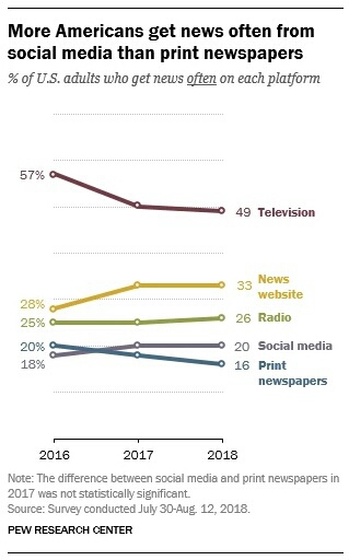Según datos relevados por el Pew Research Center, las redes sociales han superado a los periódicos impresos en los EE. UU. como fuente de noticias. Uno de cada cinco adultos de EE. UU. (20%) afirma que a menudo recibe noticias a través de los medios sociales, porcentaje sensiblemente superior al que lo hace a través de losperiódicos impresos (16%).