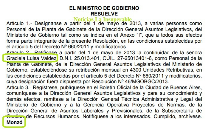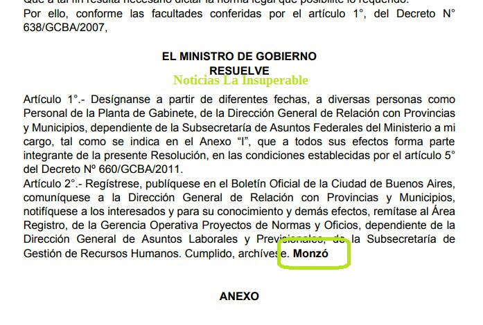 Lo interesante es que no solo quieren despegarlo de Cambiemos; en un comunicado desde la Cámara afirmaron que el conductor «nunca estuvo asignado a los traslados del presidente de la institución«, o sea, de Emilio Monzó, intentando desvincular al diputado PRO de toda relación con Figueroa. Pero si nos remitimos a la mencionada RESOLUCIÓN N° 17-MGBOGC/12 en donde se nombra dentro del gobierno de la Ciudad a Figueroa en el 2012, es por demás llamativo que la misma lleva la firma del entonces Ministro de Gobierno, Emilio Monzó y así consta en el Boletín Oficial de la Ciudad del 3 de febrero de dicho año, siendo entonces el actual Presidente de la Cámara Baja quien lo hizo ingresar al Estado.