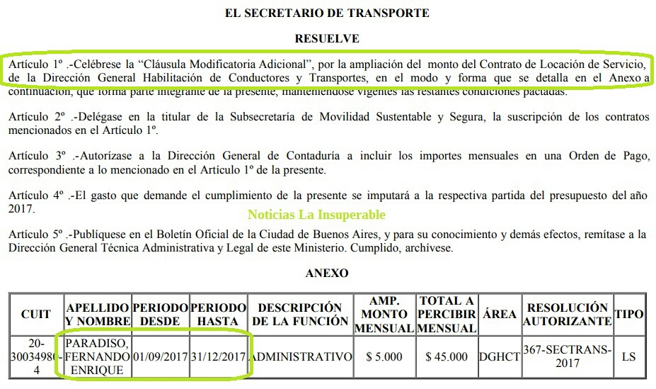 Como puede observarse en el ANEXO – RESOLUCIÓN N° 585/SECTRANS/17 Fernando Paradiso era en el momento de la contratación de Anigamy personal administrativo contratado por la Secretaría de Transporte y se desempeñaba en la Dirección General Habilitación Conductores y Transporte, que es, “casualmente” la misma área para la cual se contrató el servicio de soporte y actualización de software.