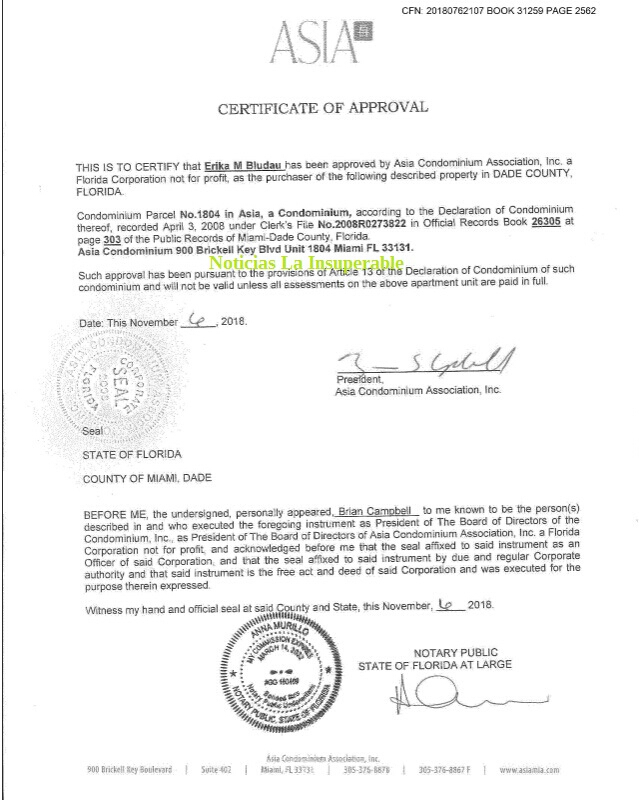 Quien acaba de comprar el departamento en cuestión es Erika Misha Bludau, una experta financista que trabaja para UBS Financial Services Inc. y que, anteriormente, hasta octubre de 2017, trabajo casualmente en el Banco HSBC de Miami, el mismo que le otorgó el préstamo a Jorge Lanata. Bludau, para hacer frente a la adquisición, recibió un préstamo hipotecario del BAC Florida Bank por U$S 1.131.000,-