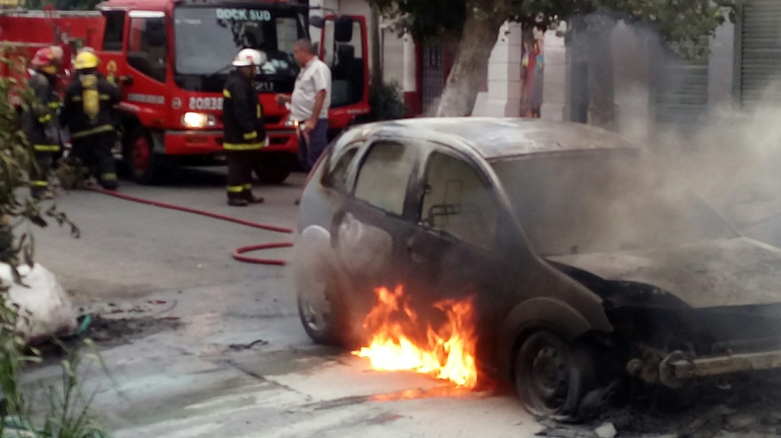 Hasta hace unos instantes, dos dotaciones de bomberos luchaban por exterminar las llamas que surgían del interior de un vehículo Ford estacionado en pleno Dock Sud.