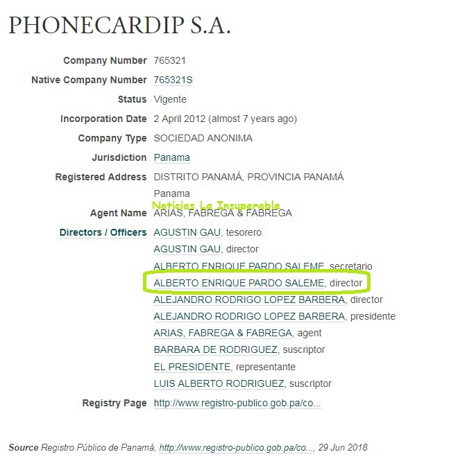 En este caso se trata de PHONECARDIP S.A., fundada en Panamá el 2 de abril de 2012 y que continúa vigente, en la que figura como Director junto a Agustín Gau, director para Latinoamérica de Mediasur, empresa dedicada a Online Marketing, focalizado principalmente en Latinoamérica y E-Commerce con presencia en gran parte de Europa.