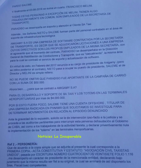 La Asociación Civil Taxistas Unidos, por intermedio de su presidente Marcelo Boeri, presentó el pasado lunes un escrito en la Justicia en la que denuncia que “La Secretaría de Transporte de la Ciudad, su Secretario titular Juan José Méndez, y 3 de sus empleados han realizado contrataciones fraudulentas o negocios incompatibles con la función pública”.