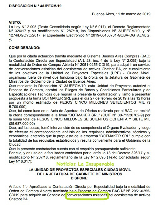 Y a Ernesto Kern parece que las palabras de su jefe le sonaron lógicas, y entonces emitió una Contratación Directa por 5.687.000 pesos para “adquirir un Servicio de conversaciones asistidas del ecosistema de activos Chatbot BA” para la firma Botmaker S.R.L., propiedad de Alejandro Zuzenberg, ex Director de Facebook Argentina.