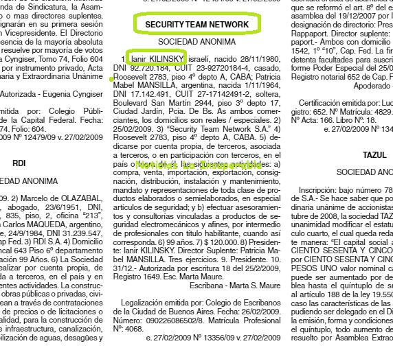 Precisamente, si buscamos en el Boletín Oficial del 27 de febrero de 2009 encontramos la constitución de Security Team Network S.A., fundada por el israelí Ianir Kilinsky y la argentina Patricia Mabel Mansilla. Ellos, el mencionado Dov Kilinsky (israelí, quien el pasado 31 de marzo cumplió 64 años) y Shira Kilinsky, entre otros, irán conformando el Directorio de la sociedad a través de los años.