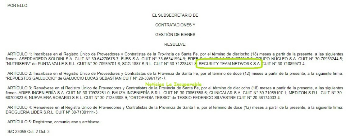 Security Team Network S.A. también provee servicios en la Provincia de Santa Fe. Así se desprende, al menos, de la RESOLUCIÓN Nº 0421 de la Subsecretaría de Contrataciones y Gestión de Bienes de dicha provincia publicada en el Boletín Oficial del 2 de octubre del año pasado, a través de la cual se inscribe a dicha empresa en el Registro Único de Proveedores y Contratistas de la Provincia de Santa Fe.