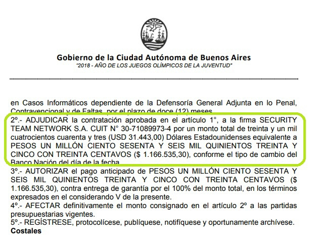 También en octubre pasado el Ministerio Público de la Defensa de la Ciudad de Buenos Aires establece la Contratación Directa de la empresa de Dov Kilinsky por USD 31.443,00 por la adquisición de software y equipamiento forense, los cuales cobra por adelantado.