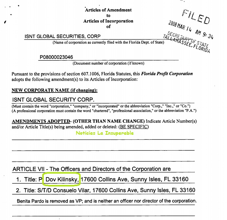 Las actividades de Dov Kilinsky no se limitan al ámbito nacional. Previo a la constitución de Security Team Network S.A., Dov Kilinsky desarrolló tareas referidas a la seguridad en el estado de Florida, Estados Unidos. Allí, por ejemplo, en 2008, fue Director de ISNT GLOBAL SECURITIES, CORP.