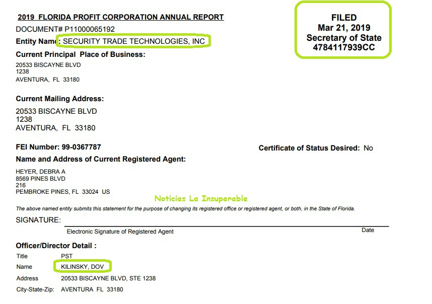 Pero no es la única empresa que dirige en el país del norte. En 2011 Kilinsky funda SECURITY TRADE TECHNOLOGIES, INC, la cual continúa activa.