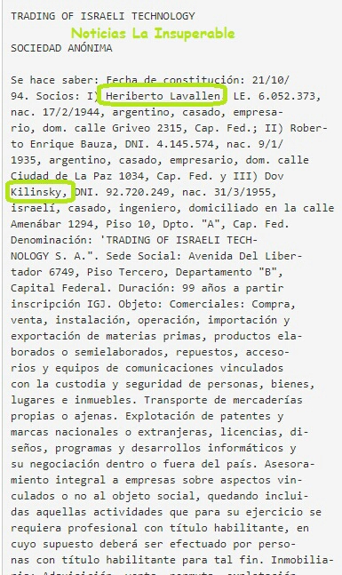 Siempre en el ámbito de la seguridad, el 21 de octubre de 1994 Dov Kilinsky funda una nueva empresa: TRADING OF ISRAELI TECHNOLOGY S.A., dedicada a la comercialización de productos de seguridad. Será allí su socio un tal Heriberto Lavallen, militar procesado, entre otros, junto al ex presidente de facto Jorge Rafael Videla en 2011, como integrante Centro de Operaciones Tácticas (COT) del Segundo Cuerpo de Ejército por la desaparición y muerte de 27 militantes del ERP, y la sustracción de una menor, ocurridos en agosto de 1976 en el Juzgado Federal N° 4 de Rosario.