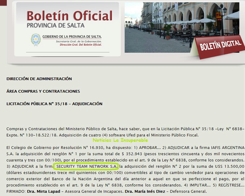 Security Team Network S.A. suele ser un habitual proveedor del Estado y, curiosamente, suele facturar en dólares. Así se aprecia, por ejemplo, en el Boletín Oficial de Salta del pasado 19 de enero cuando obtiene una licitación por U$S 13.500,00 por la venta de “software Ufed para el Ministerio Público Fiscal”. UFED (Universal Forensic Extraction Device), es un dispositivo que sirve para extraer y decodificar la información de la gran mayoría de teléfonos del mercado.