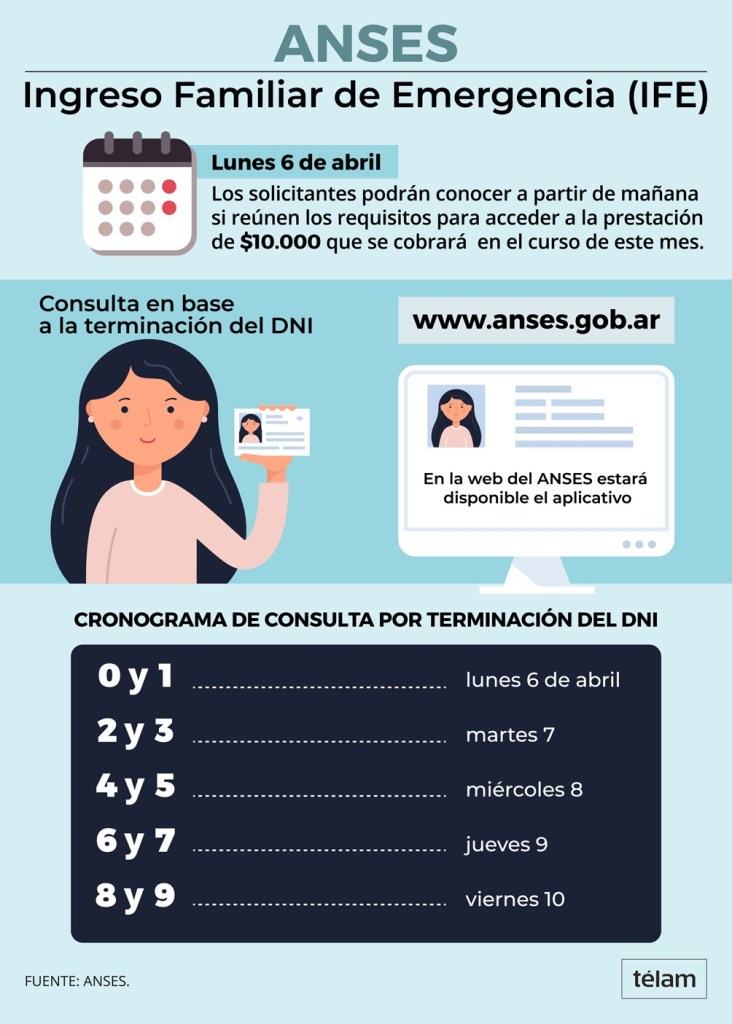 Los solicitantes del Ingreso Familiar de Emergencia (IFE) podrán conocer mediante un cronograma de consulta en base a la terminación del DNI, a través de la página web www.anses.gob.ar si reúnen o no los requisitos para el cobro de la ayuda.