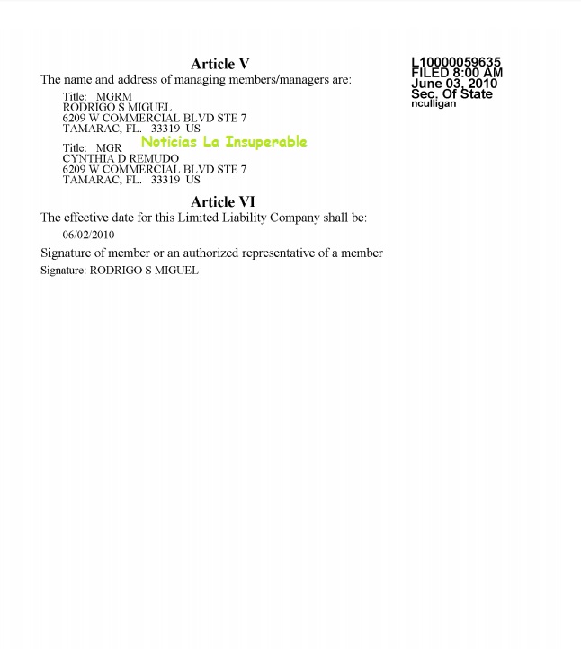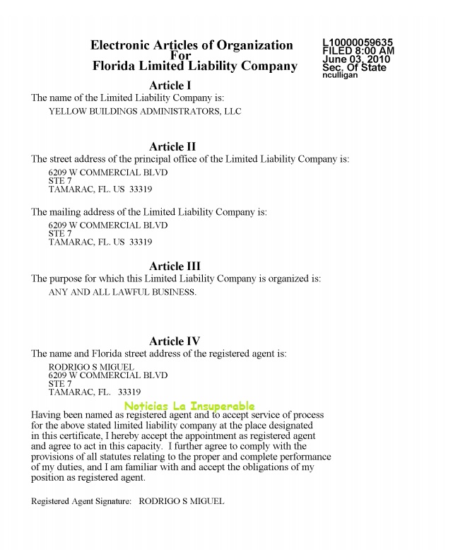 Pero tal vez la más llamativa de todas sea YELLOW BUILDINGS ADMINISTRATORS, LLC, su offshore constituída en 2010 en Florida, junto a su esposa Cynthia Remudo.
