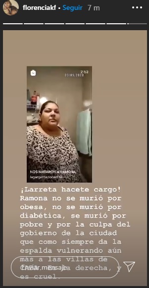 “Ramona no se murió por obesa, no se murió por diabética, se murió por pobre y por la culpa del gobierno de la ciudad que como siempre da la espalda vulnerando aún más a las villas de CABA. Es la derecha y es cruel”, escribió en su cuenta de Instagram.