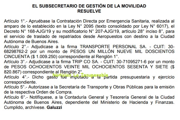 Al respecto, recién hoy, 28 de mayo, se publicó la RESOLUCIÓN N.° 329/SSGMO/20 fechada el 9 de abril (hace casi dos meses) cuando comenzaba toda la polémica de “los barbijos”, razón por la cual la guardaron en la gatera. Y es que ahoa, el gobierno porteño nos ¿sorprende? con una nueva Contratación Directapara el servicio de traslado de repatriados desde Aeropuertos con destino a la Ciudad Autónoma de Buenos Aires”.