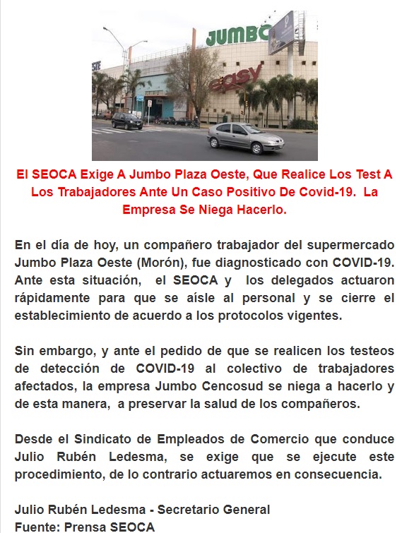 Según trascendió fue el Sindicato de Empleados y Obreros de Comercio y Afines (SEOCA) de zona oeste el cual tuvo que interceder para que la empresa actúe acorde al protocolo vigente.