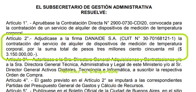 El día de hoy, a través de la RESOLUCIÓN N.° 119/SSGA/20 firmada por el Subsecretario de Gestión Administrativa Diego Perez Lorgueilleux, el gobierno de la Ciudad de Buenos Aires aprobó “la Contratación Directa N° 2900-0730-CDI20, convocada para la contratación de un servicio de alquiler de dispositivos de medición de temperatura corporal”, adjudicándose “a la firma DANAIDE S.A. (CUIT N° 30-70168121-1) la contratación del servicio de alquiler de dispositivos de medición de temperatura corporal, por la suma total de pesos tres millones ciento cincuenta mil ($ 3.150.000,00.-)”.