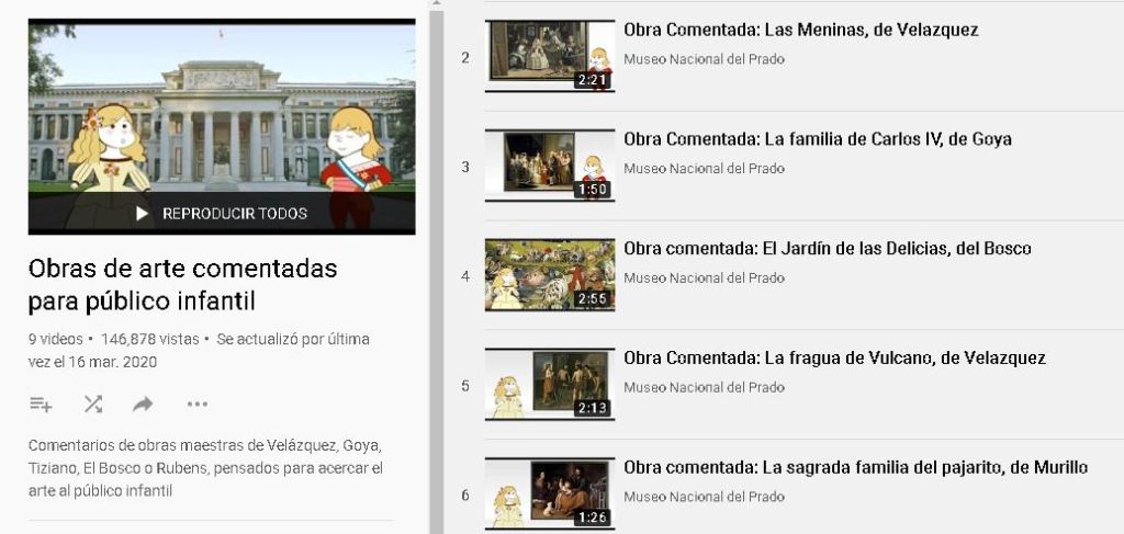 El canal de YouTube presenta audio-guías que incluyen pinturas como ‘Las Meninas’, de Velázquez; ‘El Jardín de las Delicias’, del Bosco; ‘La sagrada familia del pajarito’, de Murillo; ‘Las Tres Gracias’, de Rubens; ‘El Emperador Carlos V a caballo en Mühlberg’, de Tiziano; ‘La fragua de Vulcano’, de Velazquez, y ‘La familia de Carlos IV’, de Goya.