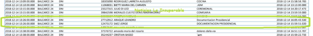 En todos ellos pueden observarse los ingresos de los espías a Casa Rosada, en general con ingresos y egresos simultáneos, y que, consta allí, eran atendidos en Documentación Presidencial.