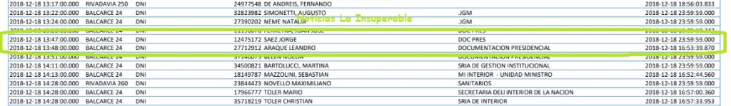 Claro que esto no significa que el diputado y los espías hayan estado juntos (más allá de las suspicacias que pueda aprejar la coincidencia horaria). Si vale como ejemplo de que todos los ingresos y egresos son registrados: el del diputado, el de los ministros, el de Marcos Peña y hasta el mismísimo Mauricio Macri aparece entrando y saliendo de casa Rosada. Todos, absolutamente todos fichaban.