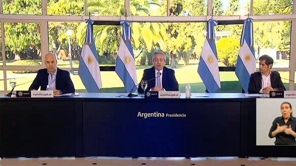 Afirmó que todo el esfuerzo que se hizo en este tiempo «no fue inútil» porque «hubiese sido peor», y enumeró los avances realizados en este tiempo «con mucho esfuerzo» de Nación, Ciudad y Provincia para que hoy el sistema sanitario esté preparado para la cantidad de casos que hoy se registran. Al mismo tiempo, el mandatario lamentó el «trágico número de 1.000 muertes», en un mensaje grabado desde la residencia de Olivos junto al gobernador bonaerense Axel Kicillof y el jefe de Gobierno porteño, Horacio Rodríiguez Larreta, en el que anunciarán la modalidad con la que continuarán las medidas restrictivas para contener el avance del coronavirus, especialmente concentrado en el AMBA. El mandatario aseguró hoy que “los casos de coronavirus aumentaron exponencialmente y a una gran velocidad” en el AMBA, y aseguró que se necesita «ganar tiempo para parar el ritmo de contagio para que los argentinos tengan la atención que merecen”.