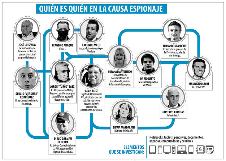 Los ex espías Leandro Araque, Facundo Melo y Jorge Sáez fueron detenidos en el marco de la causa por espionaje ilegal durante el gobierno de Mauricio Macri. También Susana Martinengo, señalada como la conexión entre los espías y el ex presidente en la Casa Rosada. La orden fue emitida por el juez Federal de Lomas de Zamora Federico Villena, quien está al frente de la causa.