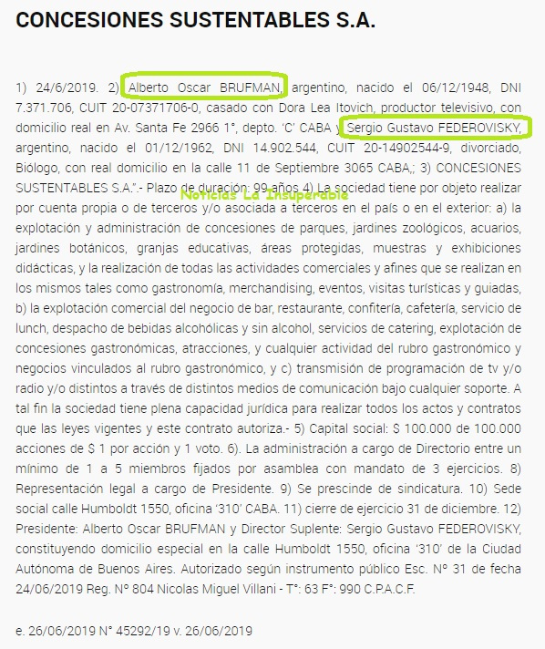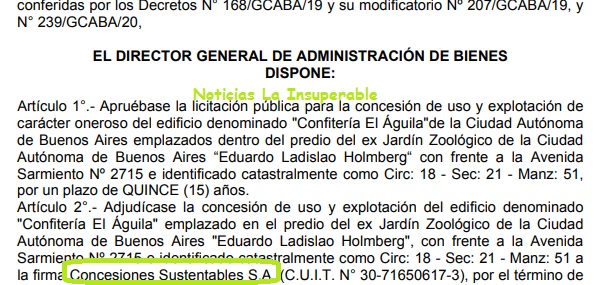 Como parte del desguace del ex Zoo porteño, vendido como un fin ecologista pero que solo apunta a un negocio de privados, el gobierno de Horacio Rodríguez Larreta acaba de adjudicar, por 15 años, el uso y explotación de carácter oneroso del edificio denominado “Confitería El Águila”, ubicado en el actual Ecoparque Interactivo de la Ciudad Autónoma de Buenos Aires, a la empresa Concesiones Sustentables S.A., integrada por los mencionados Brufman y Federovisky.