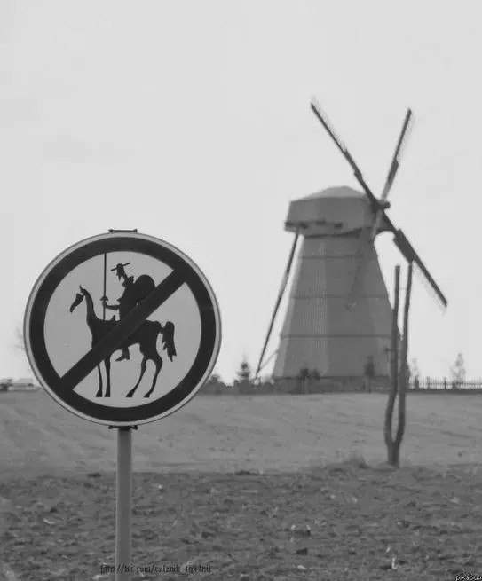 Las pícaras señales de prohibición se han incorporado, como se ve en la imagen que sigue, al acervo humorístico de la metáfora de los molinos.