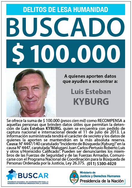 El Ministerio de Justicia y Derechos Humanos de la Presidencia de la Nación Argentina ofrece desde hace 7 años una recompensa de 500.000 pesos argentinos «A quienes aporten datos para encontrar a Luis Esteban Kyburg». El ente argentino «garantiza el carácter secreto de la información y pide comunicarse con el Programa Nacional de Coordinación para la Búsqueda de Personas Ordenada por la Justicia».