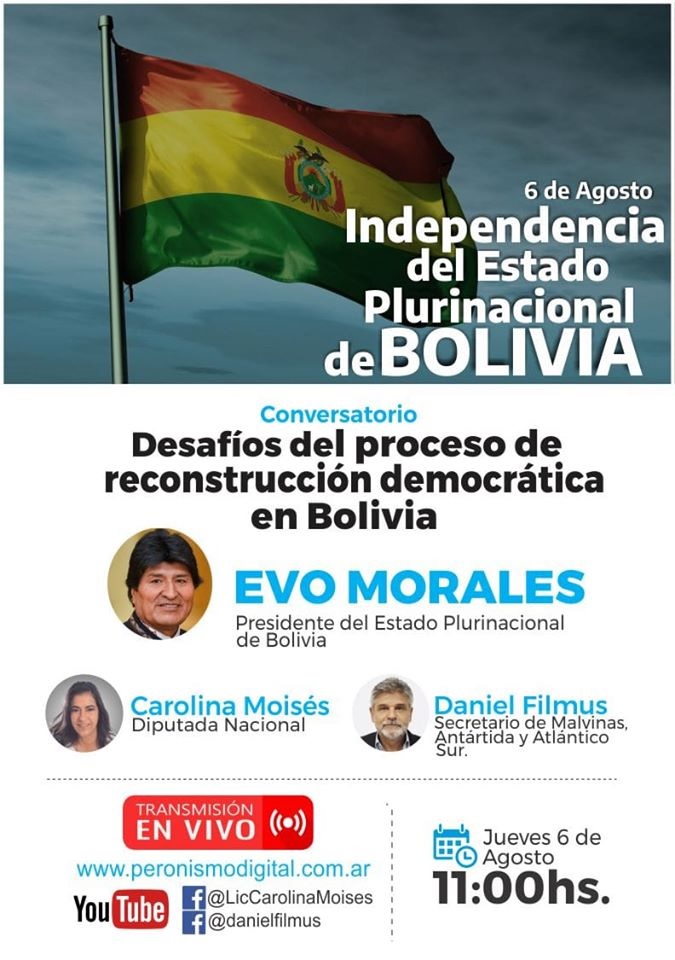 La actividad -que podrá seguirse en vivo, a partir de las 11, por Youtube a través del sitio www.peronismodigital.com.ar– se realiza en el marco de la conmemoración de la independencia boliviana.