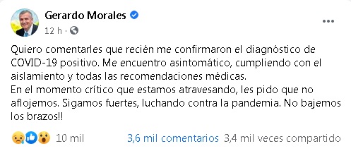 “Quiero comentarles que recién me confirmaron el diagnóstico de COVID-19 positivo”, indicó el mandatario jujeño en su cuenta de Facebook.