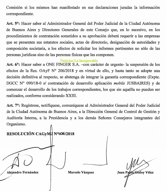 Así, con fecha 6 de noviembre de 2018 la Comisión de Administración, Gestión y Modernización Judicial del Consejo de la Magistratura de la Ciudad de Buenos Aires emitió la Resolución CAGyMJ N.º 106/2018. En la misma, en el punto XIV de los Considerandos se especifica “Que, con fecha 02/11/18, los integrantes de esta Comisión hemos tomado conocimiento, con motivo de la publicación periodística “Una Contratacion bien directa” que los ex Presidentes de la firma ONE FINGER S.A. serían empleados del Poder Judicial local y, además, que la actual presidente de la firma habría tenido un contrato de locación de servicios con el organismo”.