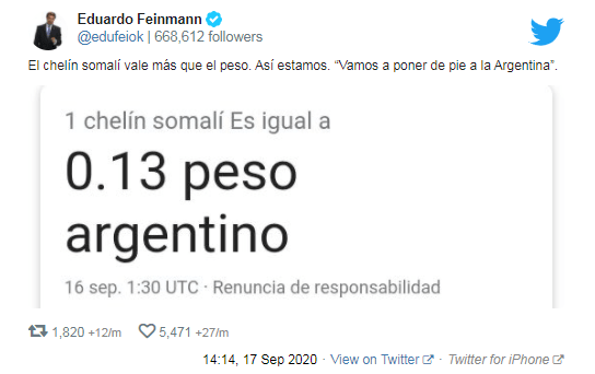 Eduardo Feinmann está dispuesto a violar todas las reglas de las matemáticas y las leyes de la economía con tal de atacar al gobierno de Alberto Fernández. Esta vez escribió una ridícula relación entre la cotización del peso argentino frente al chelín somalí.