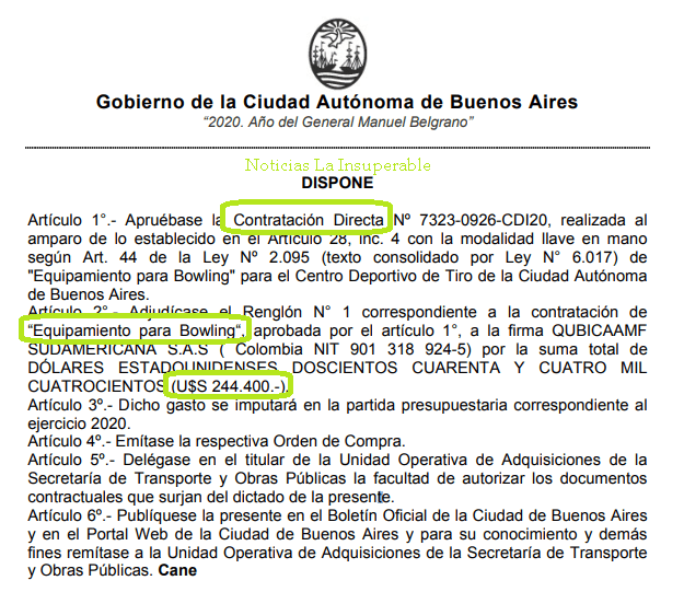 El gobierno de la Ciudad de Buenos Aires publicó hoy en su Boletín Oficial la DISPOSICIÓN N.° 20/DGINYAR/20, mediante la cual el Director de Ingeniería y Arquitectura, Claudio Alejandro Cané, aprobó la Contratación Directa Nº 7323-0926-CDI20 de «Equipamiento para Bowling» para el Centro Deportivo de Tiro de la Ciudad Autónoma de Buenos Aires.